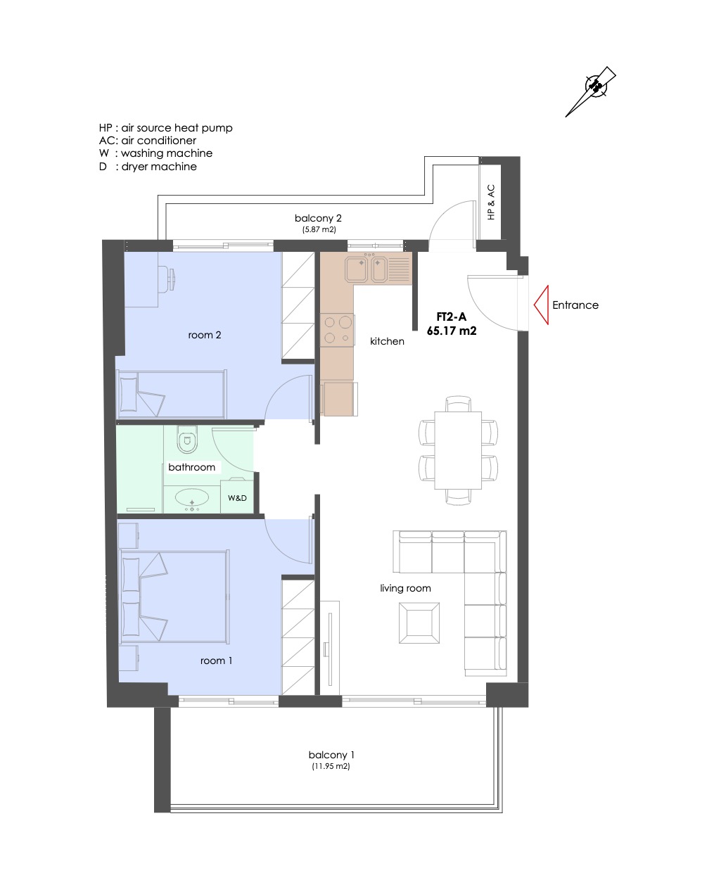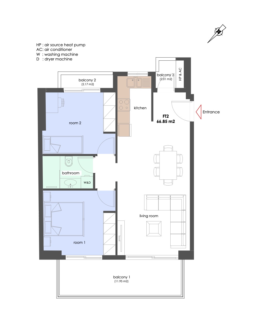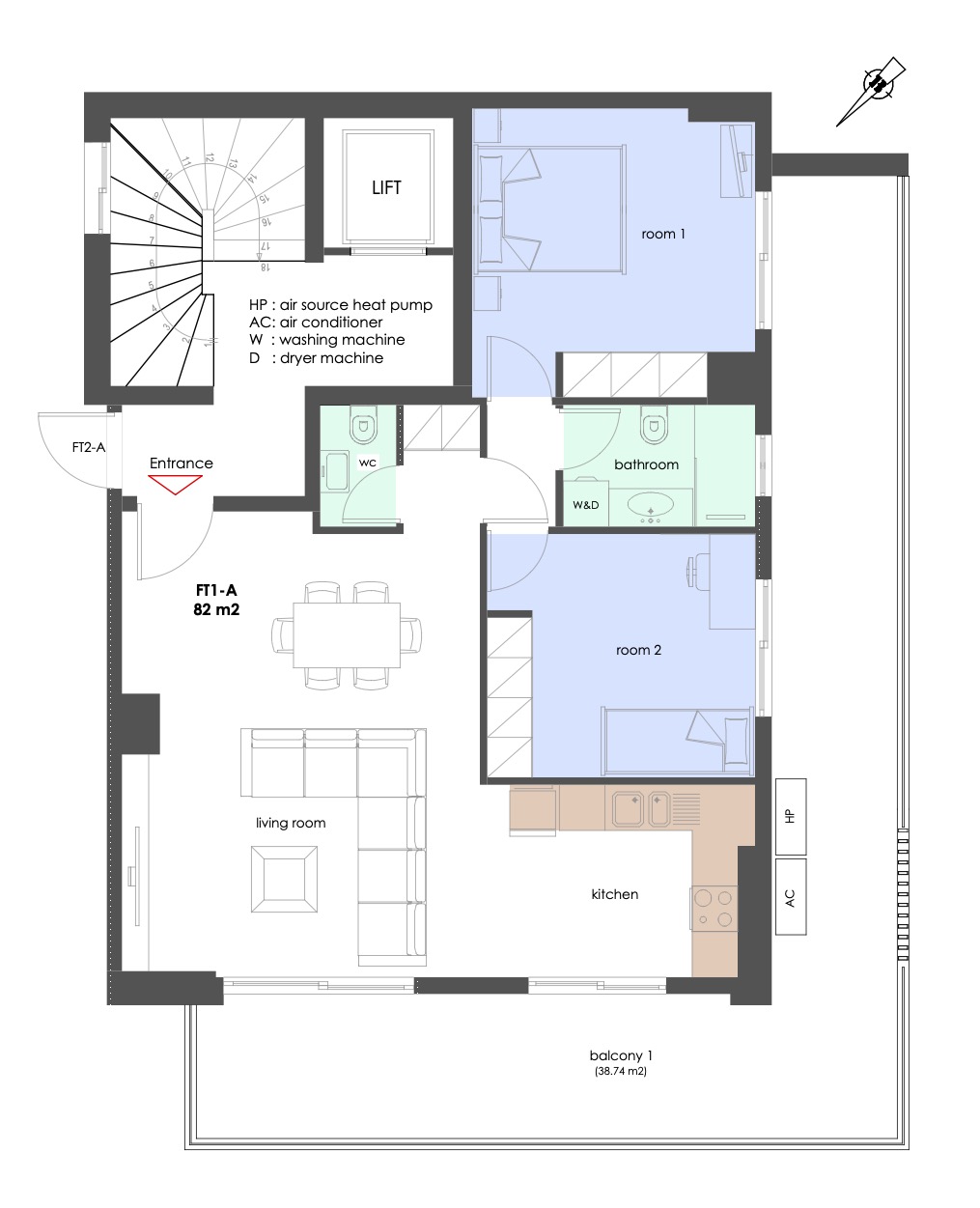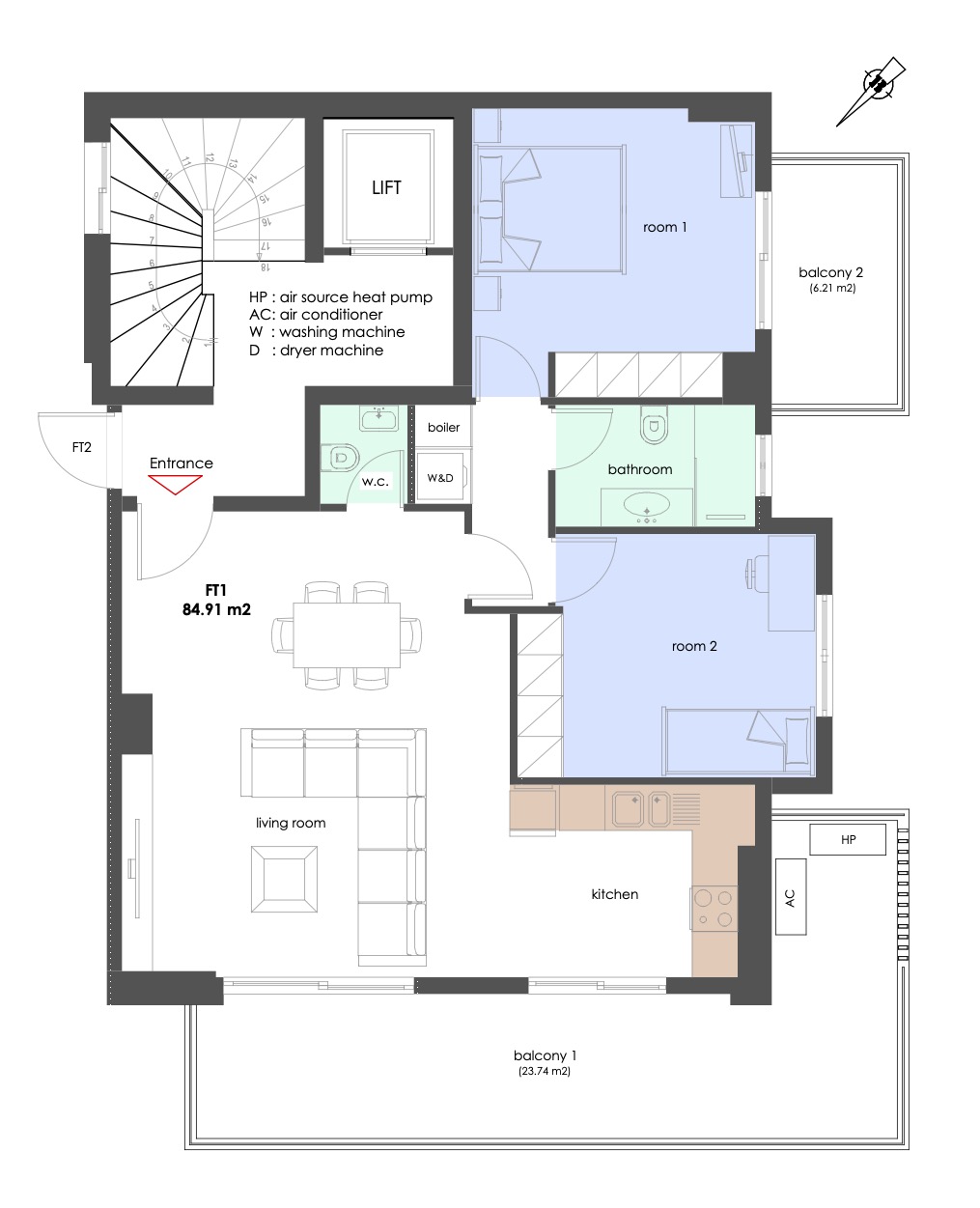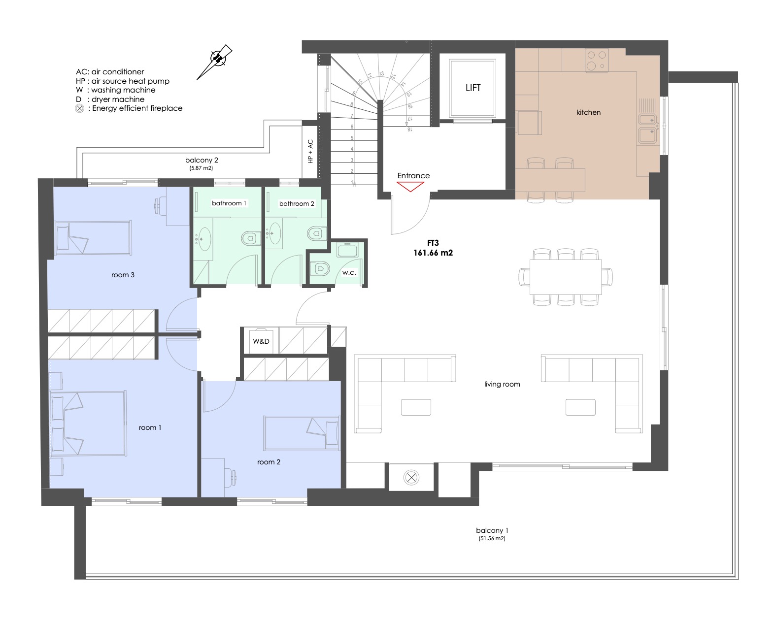 Το κτήριο αποτελείται από έξι ορόφους με δύο διαμερίσματα ανά όροφο. Στο υπόγειο τοποθετούνται οι αποθήκες των διαμερισμάτων και θέσεις στάθμευσης αυτοκινήτων, στο ισόγειο συναντάμε την κύρια είσοδο του κτηρίου και επιπλέον θέσεις στάθμευης αυτοκινήτων. Γυάλινα στοιχεία περιμετρικά της πόρτας εισόδου προσδίδουν την αίσθηση της καθαρότητας και της διάυγειας ενώ συνδέουν τον εσωτερικό χώρο με το φυσικό περιβάλλον.