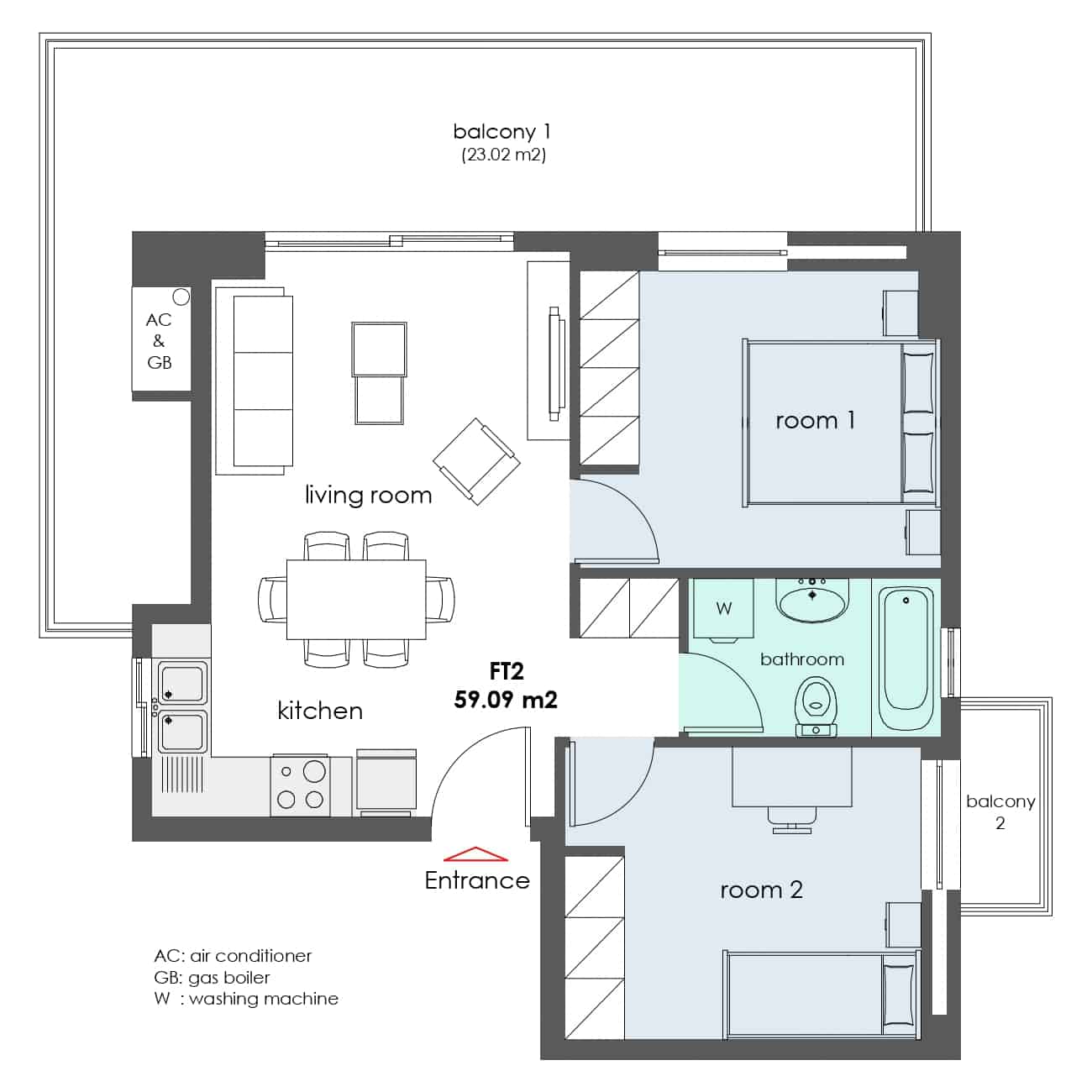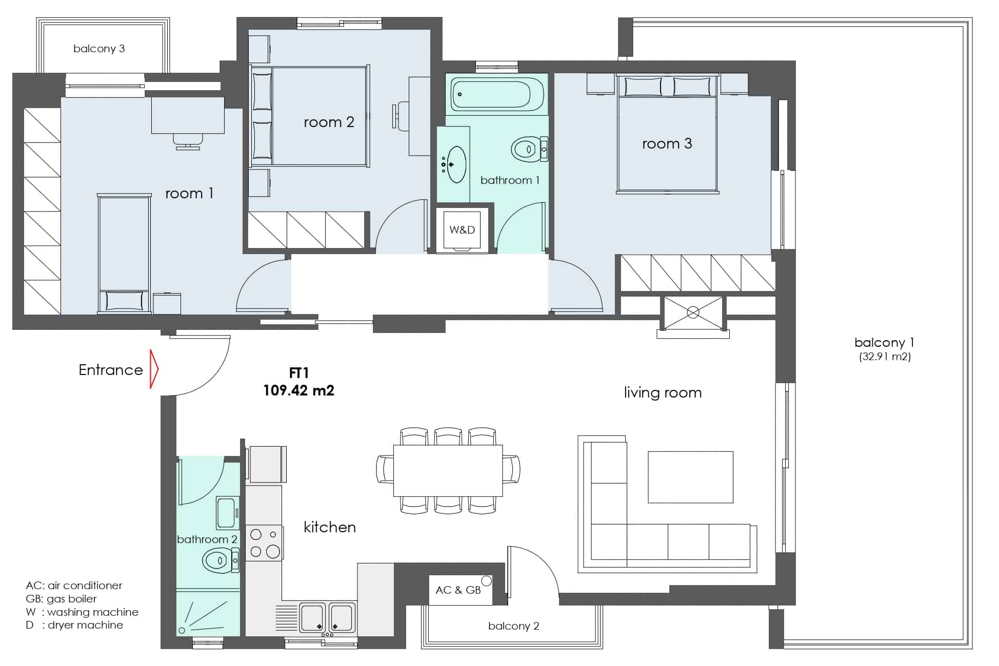 Κάθε όροφος αποτελείται από δύο διαμερίσματα, ενώ στο υπόγειο τοποθετούνται ευρύχωρες αποθήκες και θέσεις στάθμευσης αυτοκινήτων. Στο ισόγειο συναντάμε τον κήπο και την κύρια είσοδο του κτηρίου. Γυάλινα στοιχεία περιμετρικά της πόρτας εισόδου προσδίδουν την αίσθηση της καθαρότητας και της διάυγειας ενώ συνδέουν τον εσωτερικό χώρο με το φυσικό περιβάλλον.